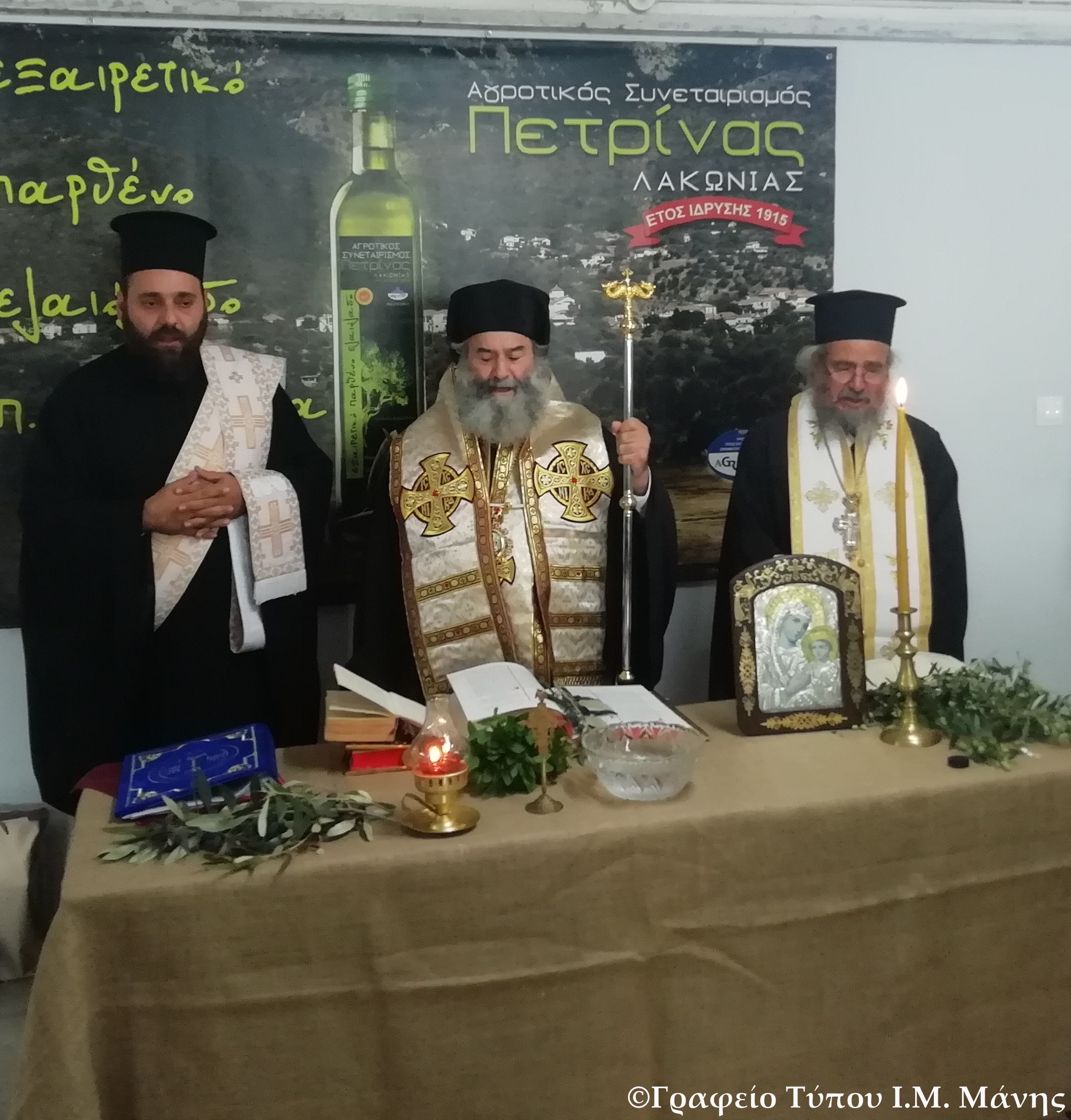 Ο Σεβ. Μητροπολίτης μας κ. Χρυσόστομος Γ’, μετέβη, χθές Κυριακή 17 Νοεμβρίου 2019, στην Πετρίνα, όπου βρίσκεται ο Αγροτικός Συνεταιρισμός και το εργοστάσιον επεξεργασίας και παραγωγής ελαίου και τέλεσε αγιασμόν, αναγιγνώσκοντας και ειδική ευχή, που ο ίδιος συνέταξε, με την ευκαιρία της νέας ελαιοπαραγωγικής περιόδου.