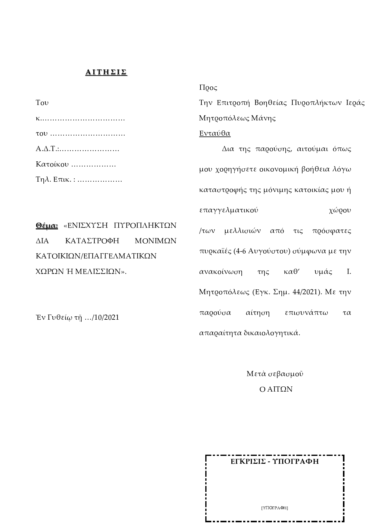 νά προβοῦν σέ αἴτηση οἰκονομικῆς βοήθειας πρός τήν Ἱερά Μητρόπολή μας ἕως 29 Ὀκτωβρίου 2021.