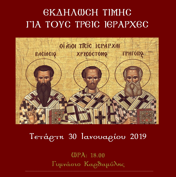 Η Ιερά Μητρόπολη Μάνης, ο Δήμος Δυτικής Μάνης, το εκπαιδευτικό προσωπικό και οι μαθητές/τριες του Γυμνασίου Καρδαμύλης και ο Σύλλογος Γονέων και Κηδεμόνων Γυμνασίου Καρδαμύλης σας προσκαλούν να τιμήσετε με την παρουσία σας την εκδήλωση προς τιμήν των Τριών Ιεραρχών, που θα πραγματοποιηθεί τη Τετάρτη 30 Ιανουαρίου 2019 και ώρα 18:00, στο Γυμνάσιο Καρδαμύλης.
