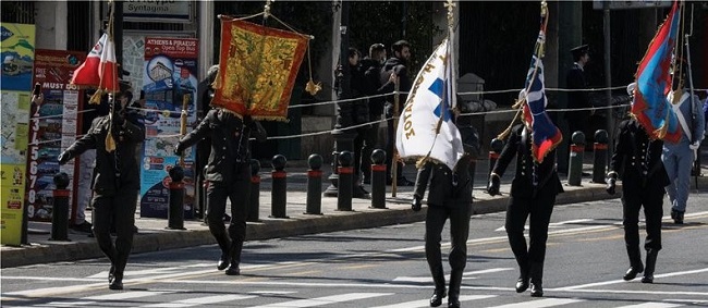 Φωτογραφία από την χθεσινή μεγαλειώδη παρέλαση στην Αθήνα, 23/3/2021, όπου παρελαύνει πρώτη η σημαία της Μάνης.