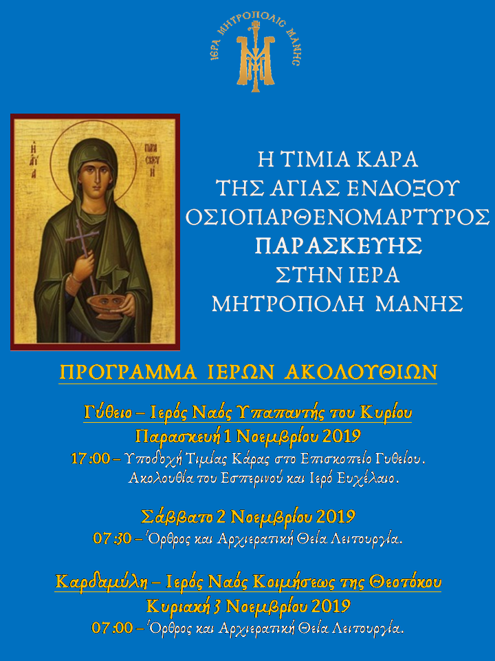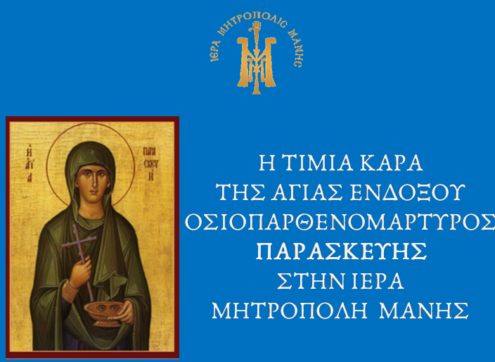 Η Ιερά Μητρόπολη Μάνης έχει τη μεγάλη ευλογία να υποδεχτεί την Τιμία Κάρα της Αγίας Ενδόξου Οσιοπαρθενομάρτυρος Παρασκευής, από τον Ιερό Ναό της Αγίας Παρασκευής του ομωνύμου Δήμου Αττικής, προς πνευματική ενίσχυση του χριστεπωνύμου πληρώματος της τοπικής μας Εκκλησίας, σύμφωνα με το κάτωθι πρόγραμμα: