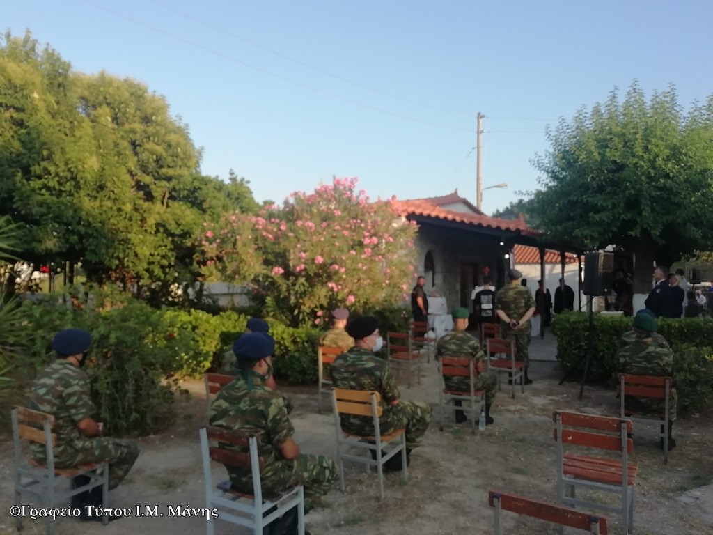 Διά τήν εορτήν της Αγίας Μαρίνης της Μεγαλομάρτυρος, μετέβη ο Σεβ. το εσπέρας της Πέμπτης 16 Ιουλίου 2020, παραμονή της εορτής, στο στρατόπεδο Γυθείου, Στρατόπεδο «Τχη ΠΖ Παν. Μαντούβαλου», όπου εδρεύει το 3ο Τάγμα ΚΕΕΜ (Σχολή Μαγείρων), όπου στον εκεί εορτάζοντα Ι.Ναό, τέλεσε την Ακολουθία του Εσπερινού, πλαισιούμενος από τον στρατιωτικό ιερέα, Λοχαγό, π. Γεώργιο Μάντζιο, τον εντεταλμένο ιερέα της Μητροπόλεώς μας για το στρατόπεδο της πόλεως πρωτοπρ. π. Ηλία Μανιατάκο, τον πρωτοπρ. π. Παναγιώτη Αρφάνη και τον διάκονο π. Χριστόδουλο Κρουστάλη.