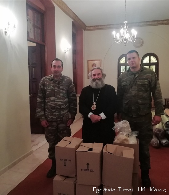 Σήμερα, Πέμπτη 19 Δεκεμβρίου 2019, αντιπροσωπεία του ΚΕΕΜ, με επικεφαλής τον υποδιοικητή του 3ου Τάγματος, που εδρεύει στο Γύθειο, Ταγματάρχη κ. Ποντικίδη, επισκέφθηκε την Ιερά Μητρόπολή μας, για να ενισχύσουν με τη δική τους συμβολή το Κοινωνικό Παντοπωλείο της καθ’ Ημάς Ιεράς Μητροπόλεως, προσφέροντας τρόφιμα μακράς διαρκείας.
