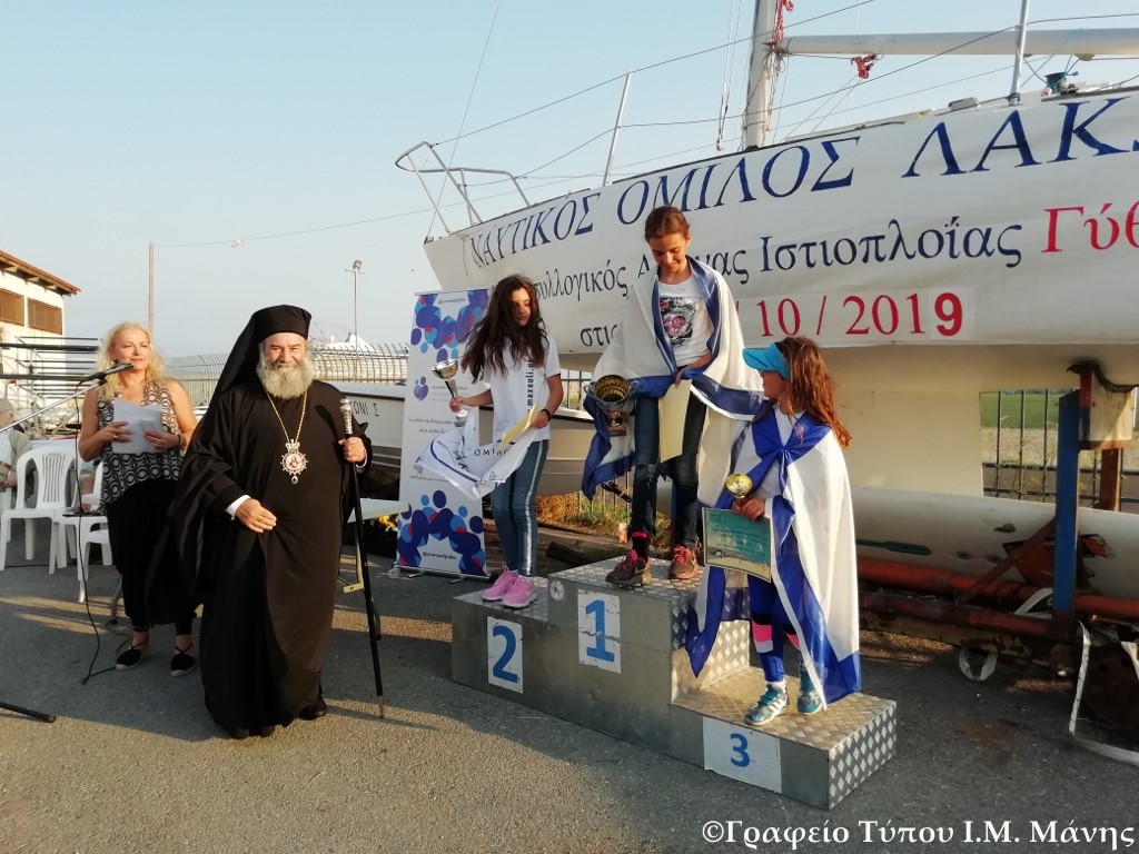 Ο Σεβ. Μητροπολίτης μας κ. Χρυσόστομος Γ’, μετέβη το απόγευμα της Κυριακής 20 Οκτωβρίου 2019, στις εγκαταστάσεις του Ναυτικού Ομίλου Λακωνίας στο Γύθειο, όπου παρέστη στην τελετή απονομής των επάθλων και μεταλλίων των νικητών των 18ων Διασυλλογικών Αγώνων Ιστιοπλοΐας που διεξήχθη στον Λακωνικό κόλπο του Γυθείου, το Σαββατοκύριακο 19 και 20 Οκτωβρίου, με τη συμμετοχή του Ναυτικού Ομίλου «Αίολος» Καλαμάτας, του Ναυτικού Ομίλου Ερμιόνης και του Ναυτικού Ομίλου Λακωνίας.