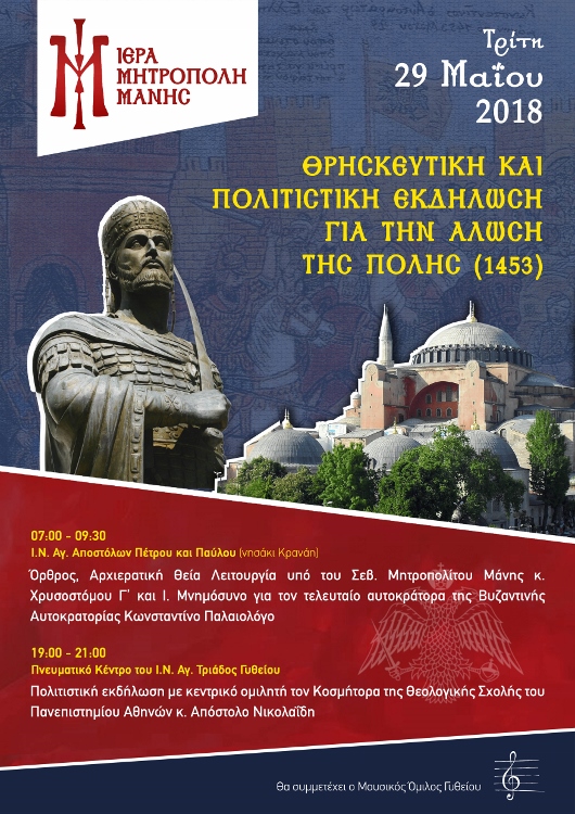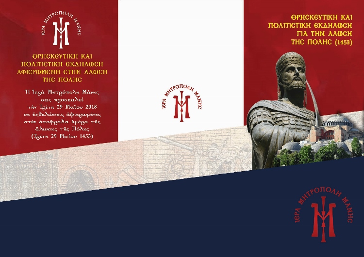 Ἡ Ἱερά Μητρόπολη Μάνης διοργανώνει τήν Τρίτη 29 Μαΐου 2018 ἐκδήλωση ἀφιερωμένη στήν ἀποφράδα ἡμέρα τῆς ἃλωσης τῆς Πόλης (Τρίτη 29 Μαΐου 1453) κατά τό ἀκόλουθο πρόγραμμα: