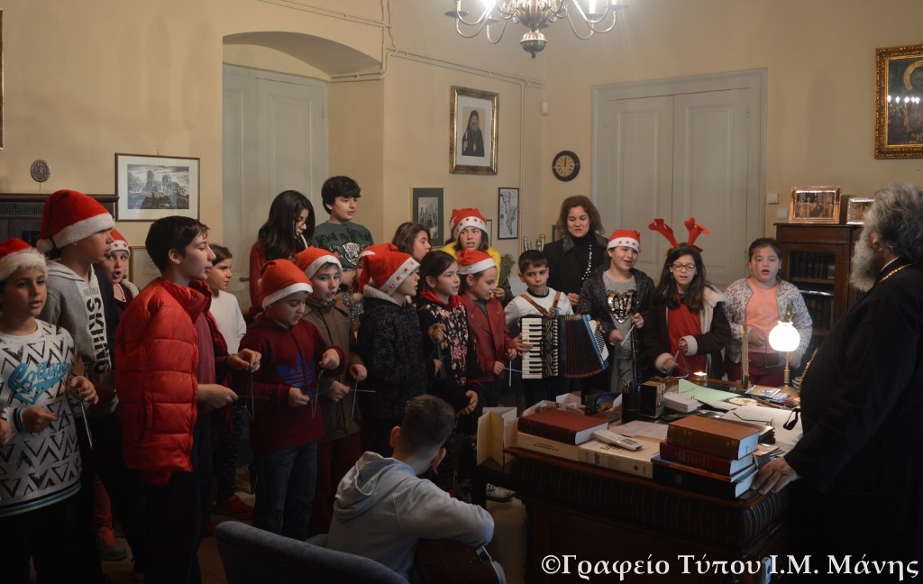 Από νωρίς το πρωί το Επισκοπείο Μάνης στο Γύθειο γέμισε από τις παιδικές φωνές δεκάδων παιδιών της πόλης που έψαλαν τα κάλαντα στο Σεβασμιώτατο.