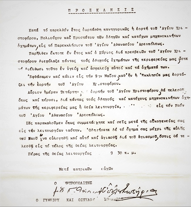 Πρόσκληση για την εορτή του Αγίου Χριστοφόρου, προστάτου των οδηγών από τον μακαριστό Μητροπολίτη Γυθείου κυρό Σωτήριο