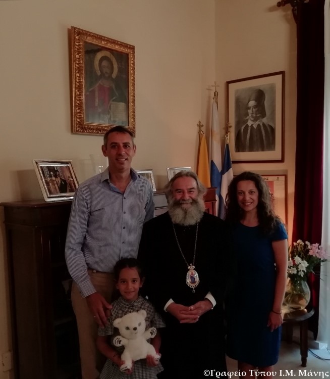 Ο Σεβ. Ποιμενάρχης μας κ. Χρυσόστομος Γ’ δέχθηκε σήμερα το πρωί στο Επισκοπείο Μάνης, εθιμοτυπική επίσκεψη του κ. Κωνσταντίνου Κουτάκος, προγραμματιστή καταγομένου από την Μάνη και της συζύγου του κας Hechine Rapyan πιανίστας, καταγωγής από την Αρμενία και του τέκνου τους.