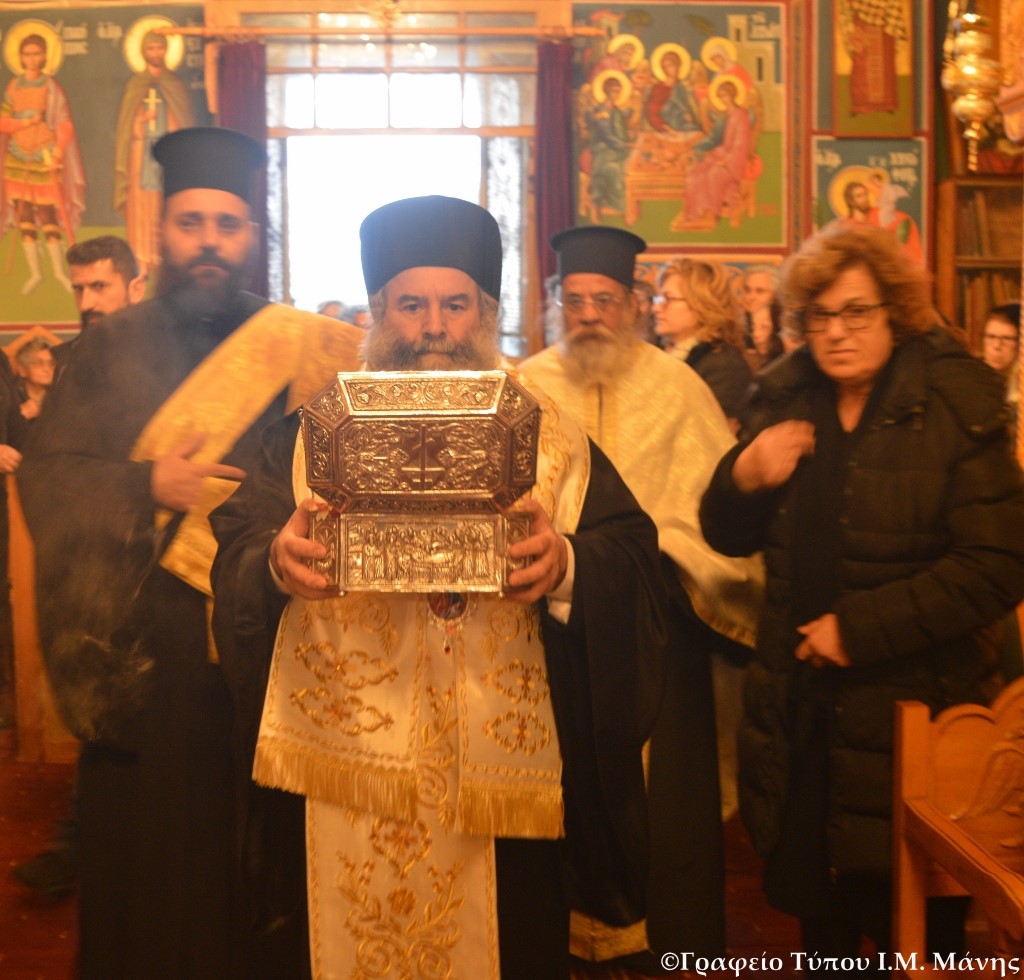 Το πρωί της Πέμπτης 24 Ιανουαρίου 2019, τελέστηκε Αρχιερατική Θεία Λειτουργία, ιερουγούντος του Σεβ. Μητροπολίτου Μάνης κ. Χρυσοστόμου Γ', με τη συμμετοχή ιερέων της Ιεράς Μητροπόλεώς μας. Ο Σεβ. Μητροπολίτης μας κ. Χρυσόστομος Γ', στη σύντομη προσλαλιά του, προς το πολυπληθές εκκλησίασμα, μίλησε αναλύοντας το απολυτίκιον του θαυματουργού Αγίου. Προ της απολύσεως της Θείας Λειτουργίας τελέστηκε τρισάγιο υπέρ αναπαύσεως της ψυχής του κεκοιμημένου ιερέως π. Δημητρίου Κουβαράκη.